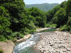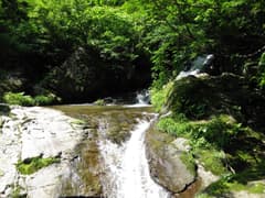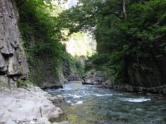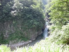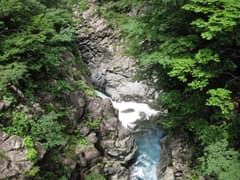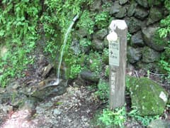 見返り岩、猿飛岩という所では、川べりに出て、清津川のゆったりとした流れと周囲の緑深い山々を眺めることが出来る。もうすっかり初夏の風景だ。時刻も正午の頃で、日向では太陽がギラギラと照りつけて暑い。さすがに疲れて、へろへろと歩く。そんなとき、道の脇に湧き出す「大峰の原水」に到着。この水は冷たくてうまかった!コップに何杯も飲んで生き返る。