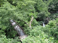 高石沢を渡ると、登山道は少し高度を上げて、再び険しくなった渓谷の断崖絶壁をトラバースする。水流からかなり高い所を通るので、下を見るとクラクラする。足元だけを見て慎重に歩き、道の脇に花が咲いていても、ここは横目で通過。やがて、前方の渓谷の下の方に、鹿飛橋の鉄橋が小さく見えた。ジグザグに下って、橋の袂に降り立った。