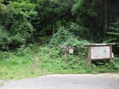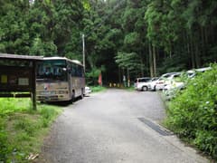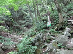 林道を辿ると最奥の駐車場に着く。今日は誰も登っていないと思っていたら、こちらには車が多く、大型バスまで来ている。ここで車両通行止めとなる。杉林の中の林道を進み、小さな流れを渡ると八丁谷の分岐に着く。ここには案内看板とWCがある。車道から別れて、薄暗い杉林の中の登山道に入る。