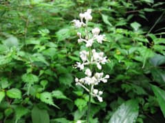 空はどんよりと曇って、林の中にも湿気が立ち込めている感じだ。ポツポツと咲いているヤブミョウガの花も水気をたっぷり含んでいる感じ。展望のない登山道だが、小尾根をひとつ越えると、経ヶ岳が垣間見える。見る方向が変わるともっこりとした山容だ。