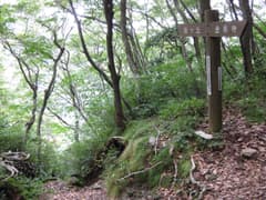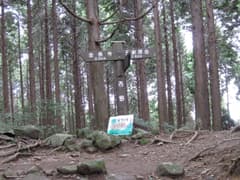 パンの残りを食べて、下山にかかる。稜線を急降下して、つが尾と呼ばれる分岐点に着く。縦走路はこの先にも続いていて、遠目山まで3時間、郡岳まで4.5時間、難路9kmという標識があった。面白そうだが、さすがにこのコースは歩く機会はないだろうなぁ。