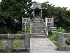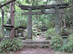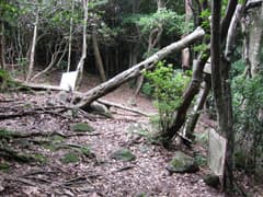 金泉寺から稜線に上がると、立派な石鳥居があり、その奥には急な石段が続いている。鳥居の傍らには江戸時代中期の1712年作と伝えられる役の行者座像があり、どういう信仰なのか、下駄がたくさん供えられていた。緑に囲まれた古い石段は結構長く続き、ジャングルに覆われたマヤ文明の遺跡を連想する。と言っても、行ったことはないですが(^^;)