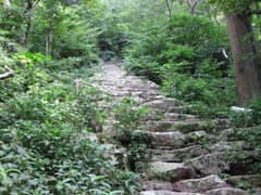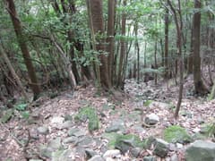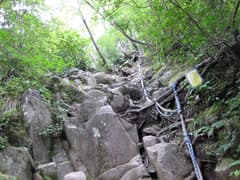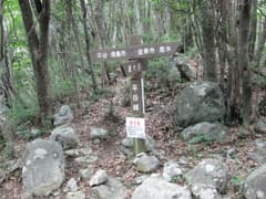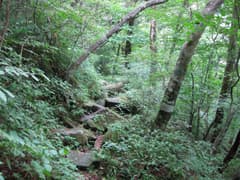 石鳥居まで引き返し、「経ヶ岳 笹岳」という古い道標に従って稜線上の踏み跡に入る。金泉寺からの道を合わせて、西岳の北東山腹を巻く登山道に入る。苔むした転石の道はなかなか歩きにくい。ハイカーさん数名と行き会う。