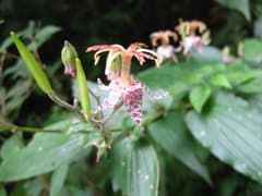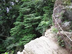 石段の途中にはホトトギスの仲間の花が咲いていた。ネット上ではしばしば写真を見ているが、生で見たのは初めて。変わった形をしているなー、とまじまじと観察する。物体Xを連想するのは私だけ?石段が終わり、山腹をジグザグに登ると、高い岩壁に梵字が刻まれた梵字岩がある。梯子や鎖場が現れるが、問題ない。