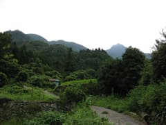 水流のある沢に下り着き、手を浸してみたらかなり冷たくて気持ちよい。やがて棚田の上部に出て、簡易舗装の道を下る。振り返ると、再び鋭峰となった経ヶ岳が聳えていた。雲が段々厚くなって、駐車場に置いた車に着いた直後にポツポツと雨が落ちて来た。途中で降られなかったのは運が良かった。