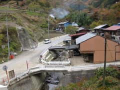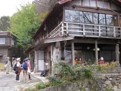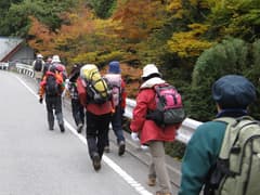 普茶料理コースのメンバー25人全員が揃った所で出発。六車大橋を渡って、底瀬川の渓流と見頃の紅葉を愛でながらテクテクと歩く。途中、山から降りて来たマイクロバスと行き会い、つれづれさんが運転手さんと話をしていると思ったら、なんとこの方がいつもHPを拝見している山が一番さんで、紹介して頂いた。