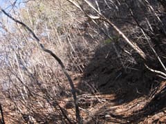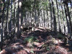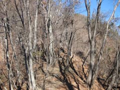 しかし、傾斜が強まるとともに道は怪しくなり、ついに岩場に突き当たる。中央突破できそうな気もするが、その先はどうなっているか判らない。やっぱり巻くのが安全か。岩場を左から巻き、雑木林の急斜面を登ると再び尾根の上に戻ることができた。