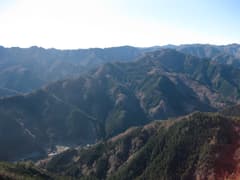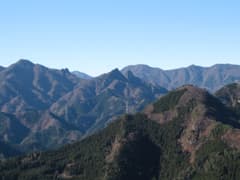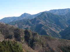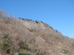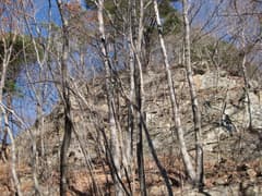 尾根上は明るい雑木林となり、右側は高い崖となって落ち込んでいる。振り返ると烏帽子岳あたりの山並が見える。この先は西上州の山らしく岩場が続く。次の第2の岩場は、踏み跡を利用して左から越える。