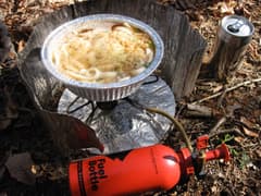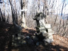 頂上には三等三角点、柱に「県民ハイク」と書かれた標識、別名の「月形山」が記された小型山名標と二基の石祠がある。展望は木の間越しに四ツ又山方面が見えるくらいで、静寂に包まれたピークだ。風はなく、日溜まりに腰をおろせばポカポカと暖かい。缶ビールを飲み、鍋焼きうどんを食べる。