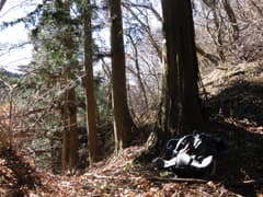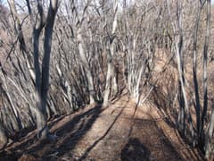 富士浅間山からは、稜線をさらに北に辿る。疎らな雑木林が続き、落ち葉を搔き分けて下る。右手後方の斜面でガサガサという音がしたので、振り返ると大きくて黒い動物が背を向けて去って行くのが見えた。あれはもしかしてクマ(@_@;)。距離があったし、逃げてくれたので助かった。