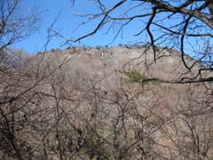 第3の岩場を右から巻いて越えると、小さな鞍部に出る。尾根を左に進んで第3の岩場の上に立ち寄ってみると、樹林が疎らになっていて眺めが開ける。尾根を見上げれば、すぐ先に高い岩壁を巡らせた岩峰がある。あれがNTGに「展望岩」と記載されている810m標高点の岩場に違いない。しかし、あの上にはどこをどうやって登るんだろう?