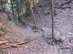 炭焼き小屋を過ぎ、小さな橋を渡って沢の左岸に移る。このあたりから山に入るのかな?橋の右側のガードレールの終端から、沢に沿って戻る方向に踏み跡を発見。これを辿ると支流の小沢を登り、やがて左に登って小尾根の上に出た。小尾根の上にもはっきりとした道型が続いている。これは良いルートかも。