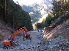 途中、沢を横断して2本のワイヤーが張られた個所を通る。土石流検出センサかな?信号線が下流に向かって延びている。やがて、沢が開けて土石の河原と化した個所に出た。これは昨年の台風の爪痕らしい。油圧ショベルもあり、(今日は日曜日で休みだが)災害復旧工事中のようだ。工事現場を抜けると九十九谷の分岐で、団体のハイカーさんが九十九谷がわらわらと降りて来たところだった。