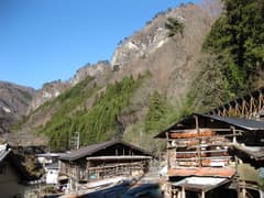 工事用の新しい砂利道を辿ると、すぐに下底瀬の集落に着いた。民家の軒先に下がった干し柿の橙色が鮮やかで、おいしそう。ここからは県民ハイクでも歩いた道だ。紅葉はとうに終わって、渓流を眺めながらのんびり下る。六車大橋を渡り、県道を南牧中学校に向かう。途中、かたくりの里の入口(駐車場とWCあり)から、稜線上にポコッと飛び出た展望岩が見えた。日向雨沢大橋を渡って、尾根の取り付き付近を再度探ってみたが、やはり登山道はなさそうな感じだった。