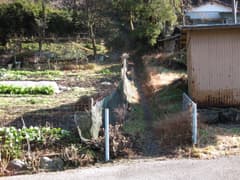 こちらの野峰登山口は、(私は前にも来ているので知っていたが)初めてだと判りにくいかも。センターの建物の右から、茶畑の脇を通って山際の細道を右へ辿ると、集落の中の車道に出る。すぐ先の右下の写真の山道が登山道だ。ここは車道と歩道の十字路になっていて、対面に「梅田ふるさとセンター→」と書いた下山向けの案内標識がある。