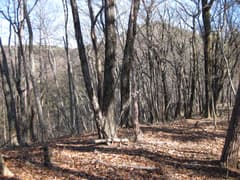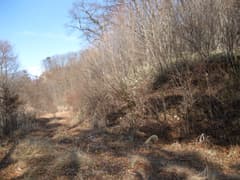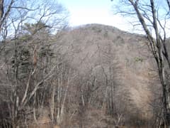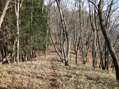 なおも尾根を登るとようやく傾斜が緩くなり、やがて杉林を抜けて明るい雑木林に入る。相変わらず展望は良くないが、木立の間から前方の野峰の丸いピークや、桐生川上流域の山々が見える。途中の杉林に覆われた暗い鞍部から右に少し下った所には、かつて野峰ヶ池という小さな池(というか水たまり)があったが、水が涸れて消えたのか、今は探しても見当たらなかった。