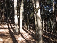 ここからは良く踏まれた掘割状の道で、尾根の上を絡むように小さくジグザグに登って行く。杉林に遮られてほとんど展望がないので、歩きに没頭するしかない。トレーニングモードをオンにして、意識的にピッチを上げる。