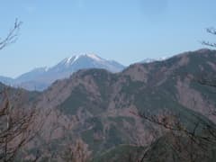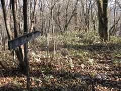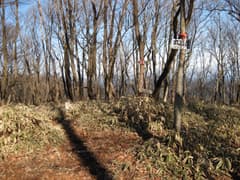 ミヤコザサの生えた短い急斜面を上がり、ピークで左折して緩く登ると、杉林に半分覆われた野峰の頂上についた。以前は全く展望がなかったような気がするが、今は北西の方向だけ樹林が切れていて、男体山を遠望することができる。聞く所によると、この冬はどこも雪がまだあまり降っていないとか。男体山の頂上の白い部分も、やはり少ない感じ。