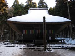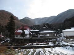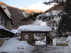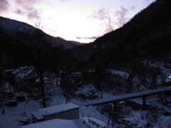 須坂長野東ICで上信越道を降り、須坂市街を抜けると日陰に雪が現れる。高山村に入り、千曲川支流松川の扇状地を上がるに連れて積雪が増え、山田温泉から先は完全に雪道になった。今シーズン新調したスタッドレスでの雪道初運転なので、大喜び(^^)。しかし、除雪されているとはいえ、深い渓谷に沿ってカーブや坂が連続するなかなかの難路だ。途中で、スタックした車も見た。