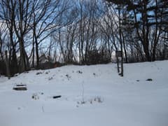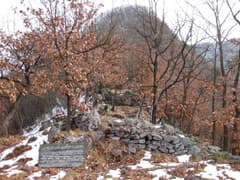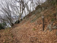 小雪が舞う天気だが、山歩きには支障がなさそうなので登り始める。枕状溶岩の左手の階段を登って尾根の突端に取り付く。登山道にも丸みのある溶岩がゴロゴロしていて、滑り易い。すっかり落葉した雑木林に囲まれ、両側が急斜面となった狭い尾根を辿る。緩く登って、小さな平地となった小城跡に着いた。城に興味が有って山を選んでいる訳ではないのだが、昨日の雁田山に続く城跡巡りの里山歩きとなる。