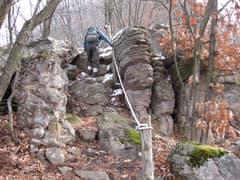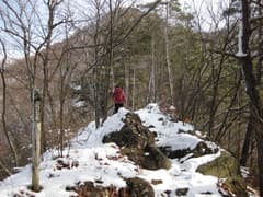 岩松院と善光寺平を背にして、露岩の多い尾根道を登る。雪は、このあたりではまだらに残っている程度だ。手摺にロープが張られるなど、道は良く整備されている。