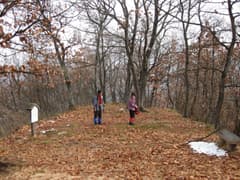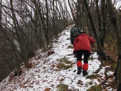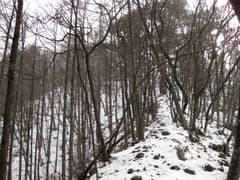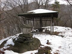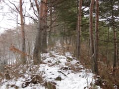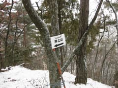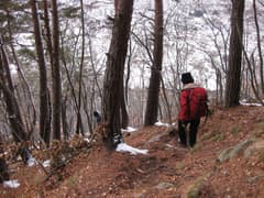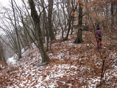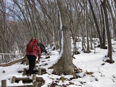つつじ台という標識のある地点を過ぎると、いよいよ千僧坊への最後の登りとなり、雑木林の中の一直線の急坂となる。積雪も増えて、手摺のロープがなければ滑り易い。一汗かいて登り着いた千僧坊は今回のコース中の最高点だが、樹林に囲まれて展望は全くない。