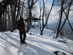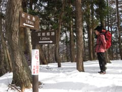 出発がのんびりだったし、急な雪道に思ったよりも少し時間がかかって、ここで既に12時半を回っているが、昼食は見晴しが期待できる東屋で取ることにして、先を急ぐ。稜線上の積雪は10cm程に増えたが、先行者のトレースがあるのでスパッツは不要だろう。