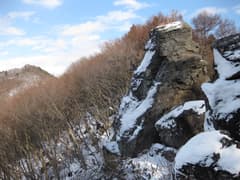 小さなアップダウンを繰り返し、転石のピークを越えて小鞍部に下ると、稜線上に高さ約10mの姥石と呼ばれる岩峰が屹立する。岩峰を巻き、短い鎖を手繰って岩峰の基部に立つと、善光寺平の眺めが得られる。
