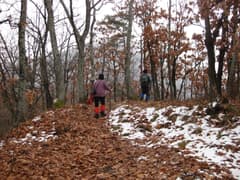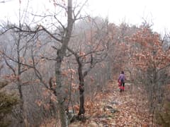 急な尾根道を登り、空堀を越えると、大城に登り着く。雑木林に囲まれた小平地で、石祠と東屋がある。大城の先は、暫くは赤松林が混じる緩い登り降りの尾根が続く。行く手には千僧坊(雁田山北峰)の三角形のピークが高く、その右には今日のコースの稜線が連なり、右端のピーク上には東屋が見える。あそこは展望が良さそうだ。