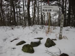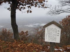 小城跡から緩い登降が続いて大城跡に着く。コンクリ製の石碑に埋め込まれた真鍮製の碑文に「井上城跡」の説明があった。中世にこの近辺を所領した井上氏が、戦さになると本拠地とした山城(普段は山麓の居館に住んでいた)とのことだ。細長い平地にいくつものベンチがあり、今日は誰もいないけど、春のピクニックなんかには良さそうな場所だ。