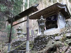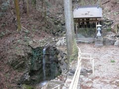 本殿に参拝したのち、少し戻って三峯山里宮からジグザグの坂道を上がると祖霊殿があり、奥の院のピークがなかなか尖って聳えているのが眺められる。祖霊殿の裏の林に入り、谷川に沿って登ると小屋があり、その先に清滝不動の滝行場がある。