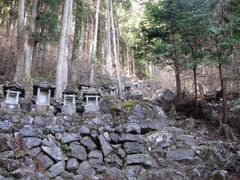 信仰登山の中心は御嶽山と三峯山のお岩戸で、ハイカーが目指す地形図上の三峰山(標高605mの三角点ピーク)は、それとはあんまり関係がないらしい。境内には○○霊神と刻まれた多数の石碑や滝行場があり、いかにも信仰登山の地らしい雰囲気がある。