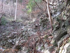 御嶽大神からも阿留摩耶山に向かう参道があるが、急斜面に付けられたあるかなしかの踏み跡で、剣吞、剣吞。今度は大人しく、寄り道せずに奥の院に向かう。こちらの道も三笠山の急斜面をトラバースする道で、足元は険しく切れ落ちて、なかなか高度感がある。