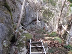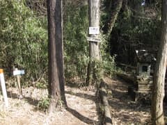 石段を登り詰めると「左 阿留摩耶山参道|右 御嶽山参道」と刻まれた石の道標がある。阿留摩耶山への道は滑り易いので初心者は避けるべき、とされているが、どんな場所か見たくてちょっと入ってみる。鉄製の古い手摺を伝って急な斜面を登って行くと、岩場にアルミ梯子が掛けられていて、その先に祠がある。これが阿留摩耶山?のようだ。この先に道はなさそうなので(あっても危ないので行く気なし)、来た道を元の分岐まで戻る。