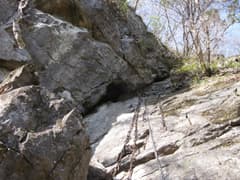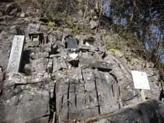 分岐から右の御嶽山参道を辿ると、急な山腹を斜めに登って「御嶽大神御岩戸入口」という石碑の建つ岩場の下に出た。ベンチがあって休憩適地だ。岩壁には鎖がぶらさがっていて、その上が「お岩戸」らしい。鎖を攀じ登ると小さな岩穴があり、膝をついてにじり入ると、中は2、3人で満員になりそうなミニ鍾乳洞になっていて、祠が祀られていた。