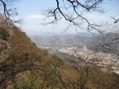 踏み跡を少し先に進むと石灰岩採掘場の端に出て、北から西にかけての展望が広がる。霞がかかって、遠くの日光連山や皇海山、袈裟丸山は残念ながらうっすらと見えるだけだが、安蘇の山並を一望することができ、眼下の広大な採掘場の眺めはなかなか迫力がある。日溜まりに腰をおろし、展望を楽しみながらランチパックを齧って昼食をとる。