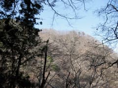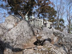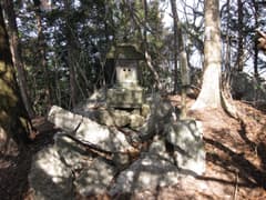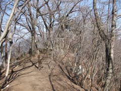 杉林の緩い谷を詰め上がって稜線に出る。明るい雑木林の尾根道を右に向かい、鳥居をくぐって露岩の上に青銅像が祀られた奥の院に着いた。樹林に囲まれて木の間からの展望に限られるが、三峰山へ続く稜線が見渡せる。