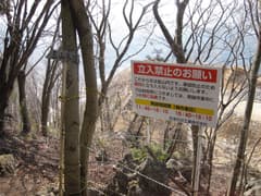 奥の院から引き返し、さらに稜線を辿って三峰山に向かう。途中で寺坂峠への道を右に分ける。緩い尾根道はヒノキ林に囲まれて展望がなく、いささか単調。やがてすぐ右手は広大な石灰岩採掘場となり、立入禁止の看板が頻繁に立ち、登山道に沿ってロープが張られている。稜線上にもところどころ石灰岩の露岩がある。途中の剣ヶ峰は、樹林に囲まれて石祠があるだけの静かなピークだ。写真を撮っただけで先に進む。