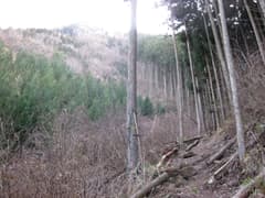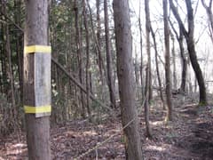 剣ヶ峰から一旦下って、鞍部から権現山へ登り返す。権現山の頂上は平坦で、ここも林に覆われて展望はない。少し進んだ所に道標があり、左に分岐する道は「←三峰大神(鎖場)」となっている。その先はどんな道か、ちょっと偵察してみると、すごい急な道だった。ここも大人しく「三峰山(三角点)→」の道標に従って右の尾根道を進む。