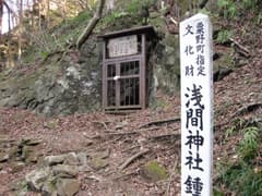 分岐まで戻り、下山道を下る。大岩の割れ目の中に祠が祀られた倶利伽羅不動明王を過ぎ、急な谷間を下って行くと、右手の山腹に浅間神社鍾乳洞がある。鍾乳洞の入口は鉄格子で囲われて、入ることはできない。中を覗き込んでも、どれくらい奥行きがあるかは判らなかった。さらに下ると古い林道に出て、あとは林道を辿る。山ノ神を過ぎるともう山麓で、駐車場の裏手に出た。