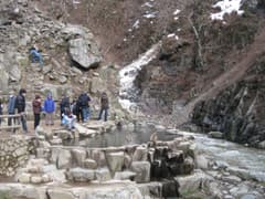 さて次は温泉へ。浴室は7人程でいっぱいになる広さだが、山中の温泉という感じで野趣満点。源泉が熱すぎるので、水を加えて温度を調節する。露天風呂(混浴)もあるが、野猿公苑へ向かう観光客から丸見えなので、暗くなってからもう一度入りに行った。川に面した湯船は灯りから遠い。のんびり湯に浸かって、峡谷の底から夜空を見上げると、たくさんの星が瞬いている。明日は天気が良さそうだ。
