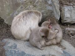 しかし、ここのサルは人間にとても慣れていて大人しく、目を合わせたりしない限りはこちらを意識している様子がない。あまり寒くなかったせいか、露天風呂に浸かって暖をとるサルは2、3匹だが、周囲には数十頭のサルがいる。観光客の数も多く、国際的にも有名な場所だけあって、外人さんの姿もちらほら。皆、熱心に写真を撮っている。中でも小ザルは可愛くて、女の子グループの格好の被写体になっていた。そのうち、係員の人がエサを撒いたら、さらに山から夥しい数のサルがわらわらと到来。ヒトとサルが混ざってカオスな状況に(^^)