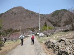 今回の目的地の奇妙山は、皆神山の左手のゆったりとした山容の山だ。りんごやあんず畑、石垣や蔵が立派な民家の間を縫って狭い車道を登り、登山口の駐車場に着く。ところが、2〜3台分の駐車スペースは既に満杯。道を少し戻って、邪魔にならないように道端に車を置いて、歩き始める。
