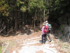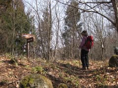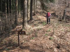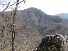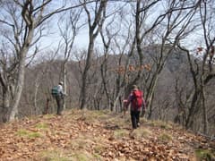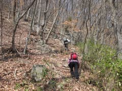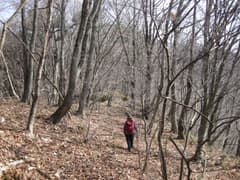 尾根上の小さなアップダウンを進む。案内図には笹やぶと書かれた箇所もあるが、藪はなくて、問題ない。鞍部に下ると、右に岩沢登山口への道が下っている。直進して、杉林と雑木林の間の急な尾根を登る。途中で三組目のハイカーさんとすれ違う。出会いの石という標識が掛かった岩があり、左にJA総合研修所へのコースが分岐する。