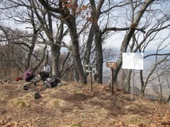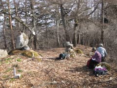 尼巌山の頂上は立見岩のすぐ上だ。頂上は明るい雑木林に囲まれた長い広場で、木の間から善光寺平や飯綱山などが展望できる。ここには鎌倉時代以前から尼巌城と呼ばれる山城があり、戦国時代には武田信玄も防衛の一拠点としていたそうだ。ハイカーさんが一組、休憩していた。我々もここでお湯を沸かしてスープを作り、パンやコンビニのおにぎりなどで昼食とする。風もなく穏やかで、暑いくらいの良い天気だ。