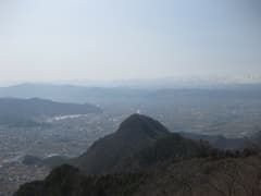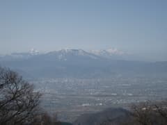 ここからは明るい雑木林の尾根道が続く。やがて、高見岩と呼ばれる大きな露岩が現れる。転落注意という標識を見て、注意して上がると、尼巌山や松代の平野、千曲川の展望が開ける。遥か遠くには鹿島槍から五竜、唐松あたりの北アの山々が白銀の峰を連ねている。霞がかかっているのがちょっと惜しいが、これはいい眺めだ。