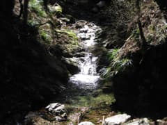 広場の奥の木橋から右に分かれる沢が、県境を流れる穴切沢だ。この沢は、2006年12月にMHC県境歩き隊が遡っている。入口はちょっと沢登りの雰囲気だが、沢沿いに細い作業道があり、水流の中を歩く必要はない。