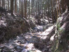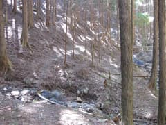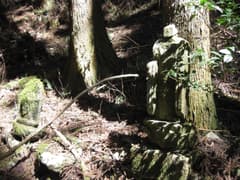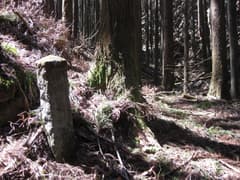やがて、谷間が開けた広場に出ると、お顔が欠けて苔むしたお地蔵さんがある。いつごろ建立されたものだろうか。今ではこの一帯は杉の植林で、山仕事と物好きなハイカーの人しか訪れないと思われる。