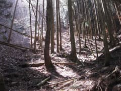 二股を右に進むと、浅い三つの窪に分かれ、真ん中の窪を登って行く。やがて、稜線下の崖に突き当たるので、右の杉林の斜面を登る。こちらも木立を摑んでいないと転げ落ちそうな急斜面だ。左上から人の話声がするので、上は確かに赤雪山〜仙人ヶ岳の稜線のようだ。しかし、こんな所を登っているのを見られたら、変に思われるだろうな(^^;)。幸い声だけで、人影を見ることはなかった。