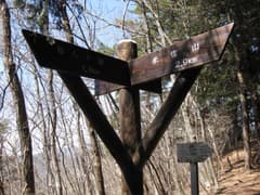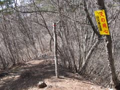 息を切らせて稜線によじ登り、稜線上を左に進むと、すぐに赤雪山〜仙人ヶ岳縦走路に出た。ほぼ忠実に県境をトレースできたようだ。縦走路を辿ると、立派な道標のある三角山の肩に着く。三角山の頂上はこのすぐ右で、「623m」と書かれた標識が梢にぶら下がっているのと、桐生市基準点No.103がある。木立に囲まれて展望はなく、あんまり冴えないピークだ。すぐに仙人ヶ岳に向かう。